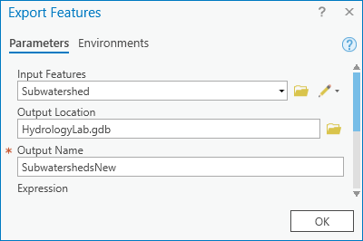 By default, the ‘Export Features’ window will only export the selected features using the coordinate system of the data source. Also notice that the output location defaults to the HydrologyLab geodatabase, because that is your default geodatabase for this project.