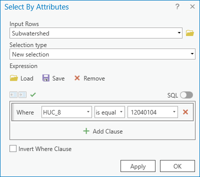 - In the 'Select By Attributes' window, use the ‘Input Rows’ drop-down menu to select the Subwatershed layer, if necessary.