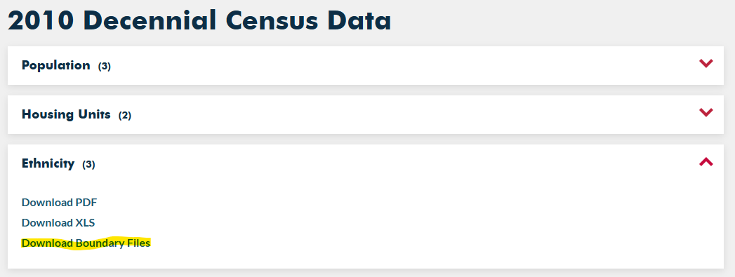 - Under the '2010 Decennial Census Data' section, in the 'Ethnicity' column, click Download Boundary files.