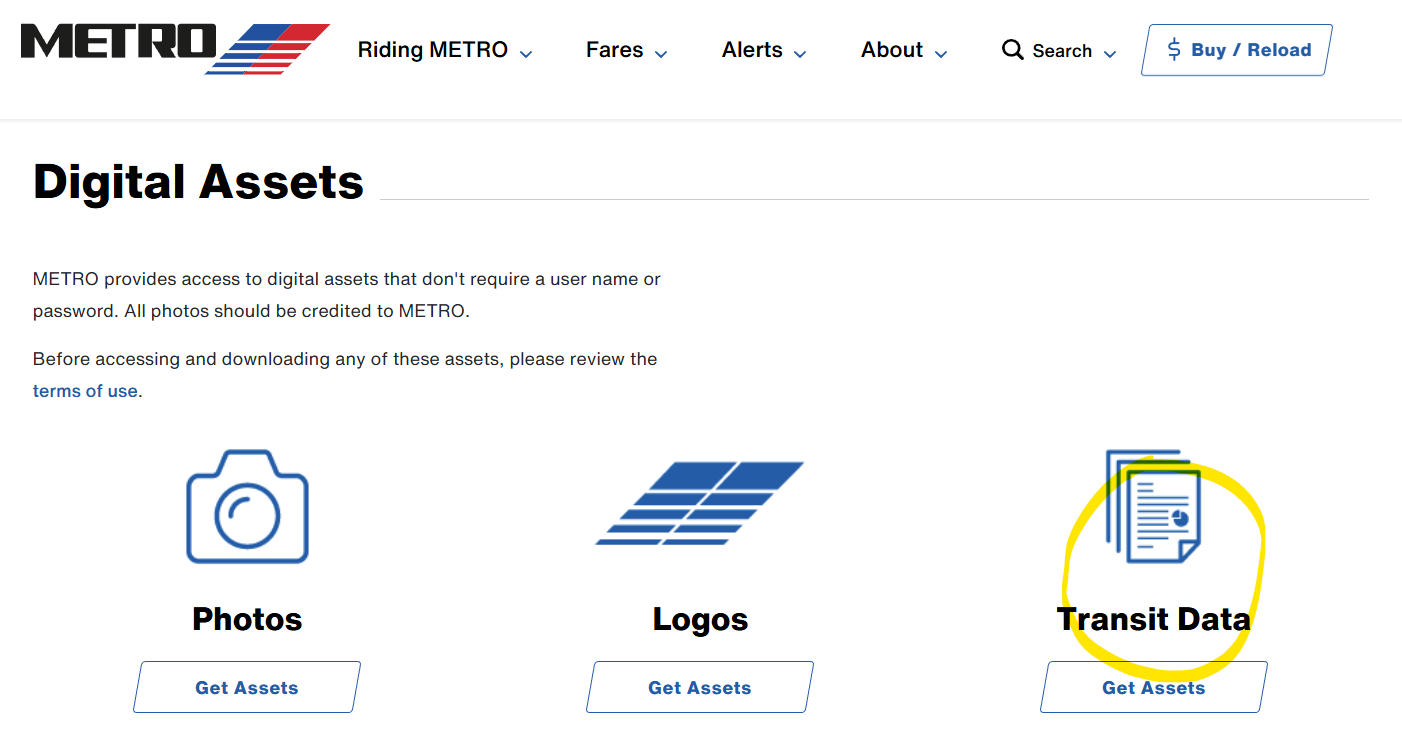 - Scroll down to the bottom of the webpage to Digital Assets and select Transit Data and Get Assets.
