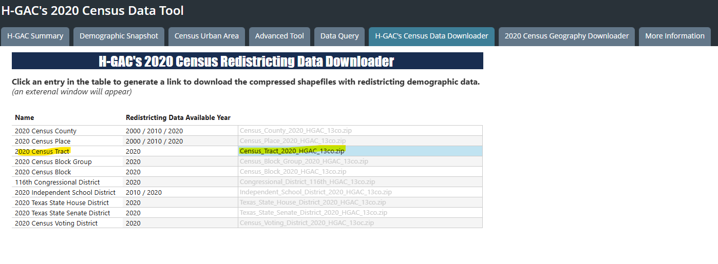 Most of the data provided on the H-GAC portal is not originally created by the H-GAC. Instead, the data is either aggregated from multiple municipalities up to the 13-country region, or clipped from the entire country or state down to the 13-county region. For this tutorial, we will download population and housing data from the 2010 census, which has been aggregated to census tract boundaries.
