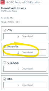 - At the bottom of your browser window, you should see the HGAC_Major_Roads-shp.zip compressed folder downloaded.