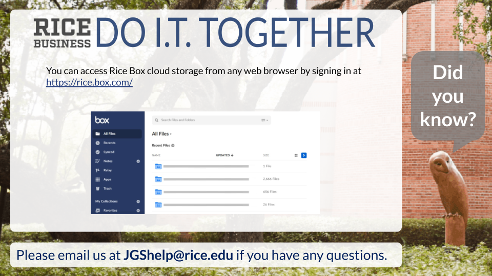 Did you know? You can acces Rice Box cloud storage from any web browser by signing in at https://rice.box.com/