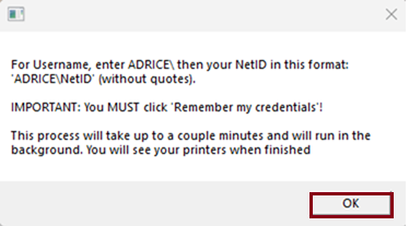 - Enter adrice\YourNetID in the username field, and netid Password in the Password field. Make sure to check the box next to "Remember my credentials."