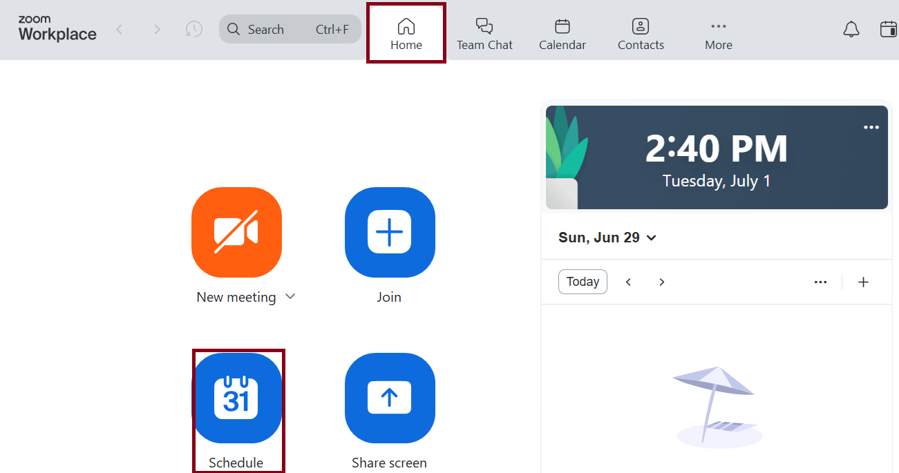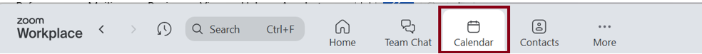 - Open the Zoom Workplace Desktop App (note the Calendar tab on the Menu bar if you have the Zoom Calendar Integration Service enabled).