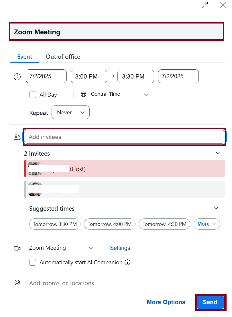 - Enter a description for your Zoom meeting. Select the appropriate date/time. Add invitees and click Send. A meeting invite with Zoom link will be sent to the invitees.