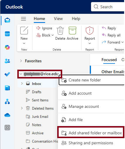- Right-click on your account name and choose Add shared folder or mailbox.