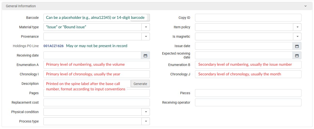 | Description | This field is printed on the spine label immediately after the base call number, so include captions. Be consistent and format the description to include the same levels of enumeration and chronology and the same captions as previous issues or bound volumes. Follow the input convention rules above to format this field. Note: The description does not have to include all elements from the enumeration and chronology fields. |