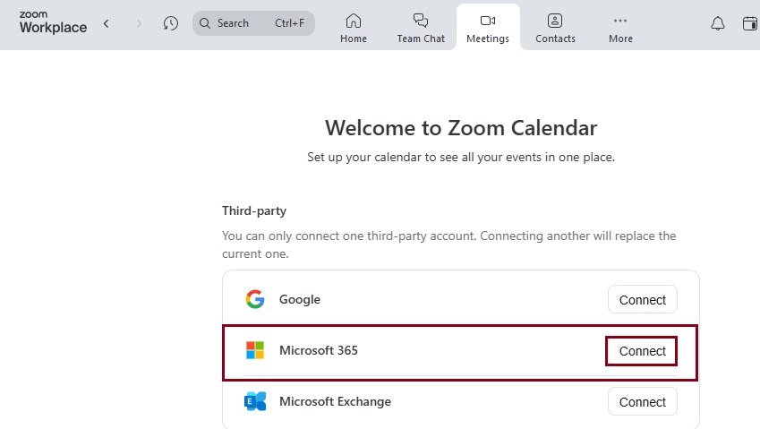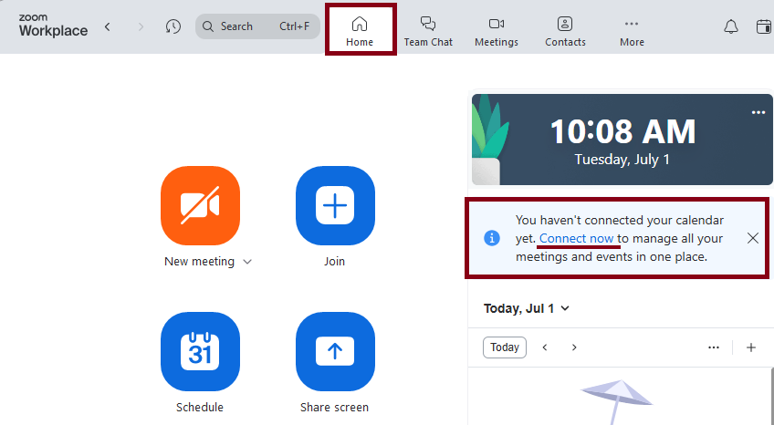 - On the Home tab, click Connect Now. (You will not see the message to Connect Now if you already have the Zoom Calendar Integration Service enabled).