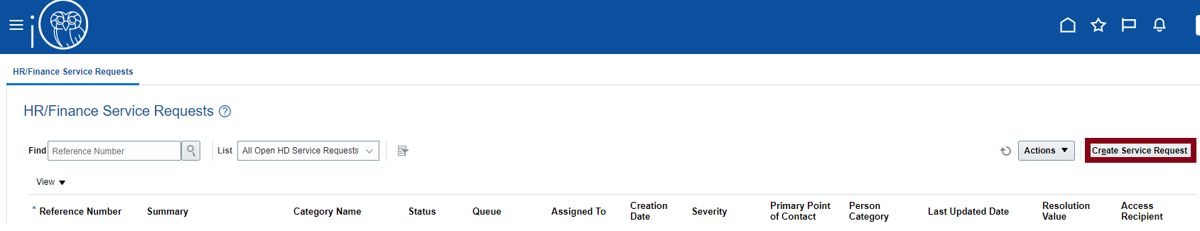 - Go to HR/Finance Help Desk, and click on HR/Finance Service Requests