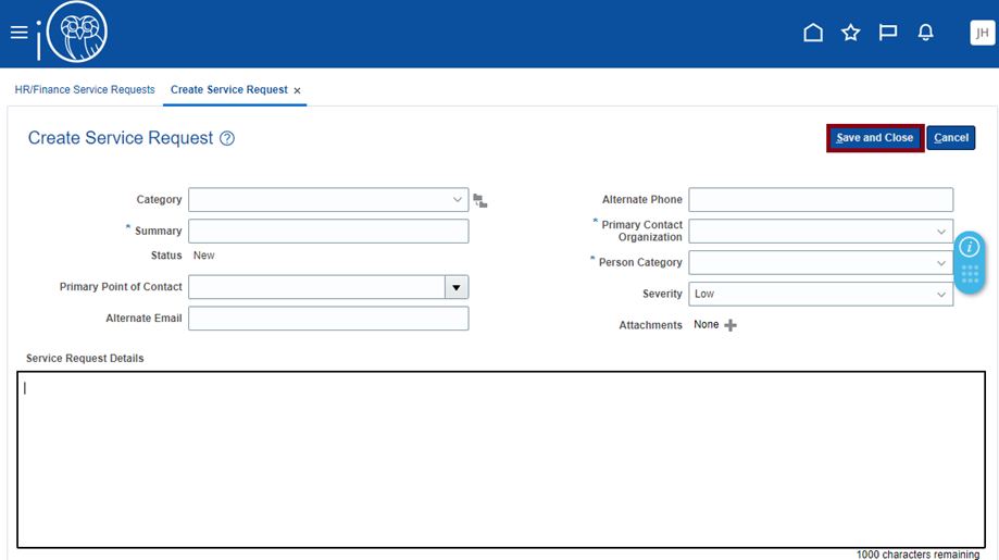 - Enter your Service Request details. Select Save and Close when you are done entering your Service Request